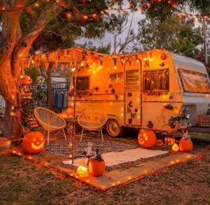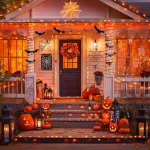 Ilumina calabazas con luces LED amarillas o naranjas en lugar de velas (más seguro y duradero). Enrolla tiras LED en árboles, rejas o columnas del porche.