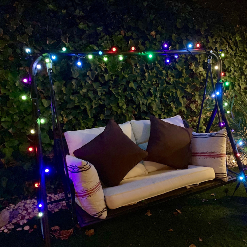 El cable de caucho negro otorga resistencia y discreción, ideal para instalar en exteriores durante largos periodos. La protección IP65 garantiza su uso seguro en condiciones climáticas adversas como lluvia o humedad, convirtiéndola en una opción preferida por ayuntamientos, espacios comerciales o instalaciones urbanas para crear atmósferas festivas de gran impacto visual.