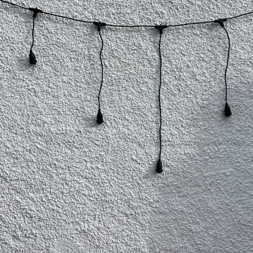 Fabricada con cable negro de caucho profesional y protección IP65, es resistente a la lluvia y a las condiciones exteriores, lo que garantiza una durabilidad excepcional tanto para uso doméstico como comercial. Cada guirnalda incluye 60 casquillos E27 colgantes con gomas de estanqueidad para un sellado perfecto, alternando caídas de 30 cm, 60 cm y 90 cm que aportan dinamismo y volumen visual.