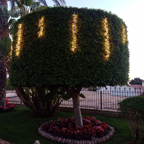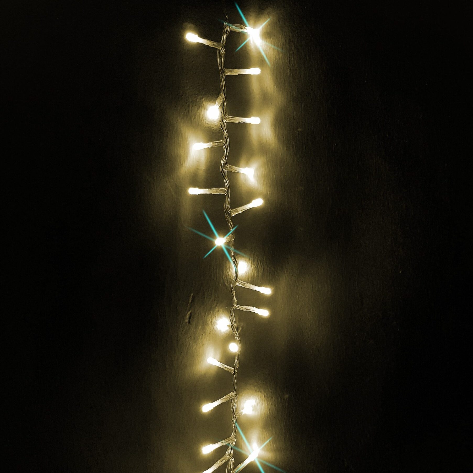 Se pueden colocar en posición vertical creando un efecto similar a lianas de luz cayendo de los árboles o del techo, dando un toque mágico a cualquier espacio. Esta guirnalda llamada “cluster” o “festón” tiene más número de miniLEDs que las guirnaldas convencionales, agrupados de forma irregular, generando una sensación de mayor densidad lumínica y un brillo más intenso. Perfecta para decoraciones impactantes y dinámicas.