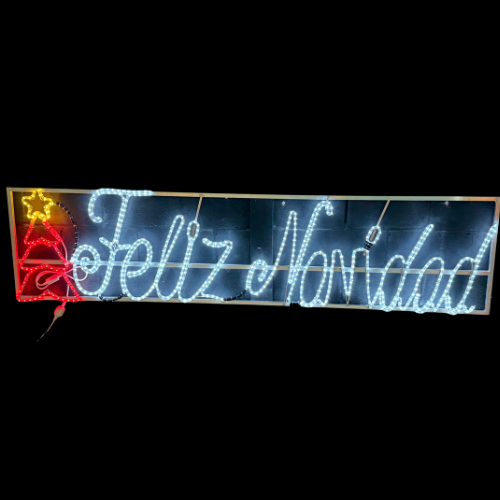 La estructura del letrero feliz navidad está fabricada en hierro y forrada con manguera de luz led de colores. Ideal para decorar.