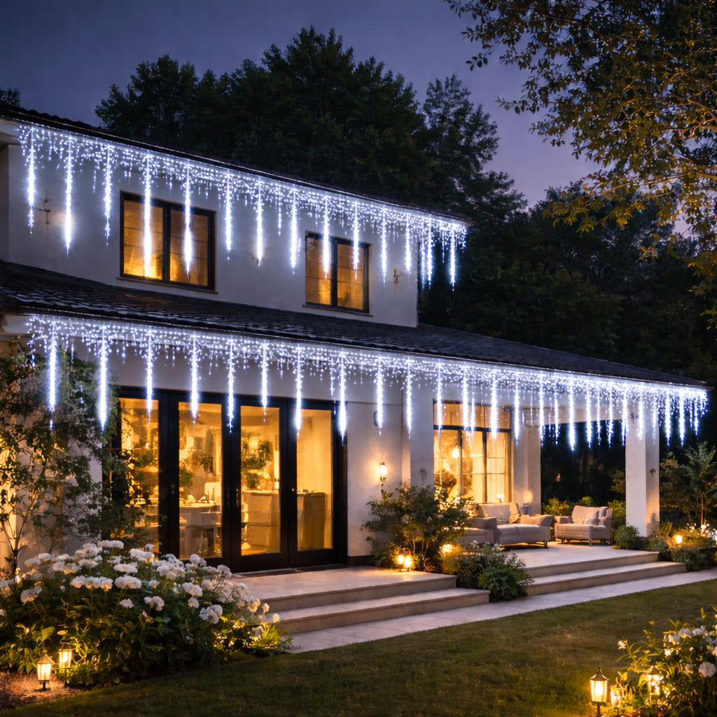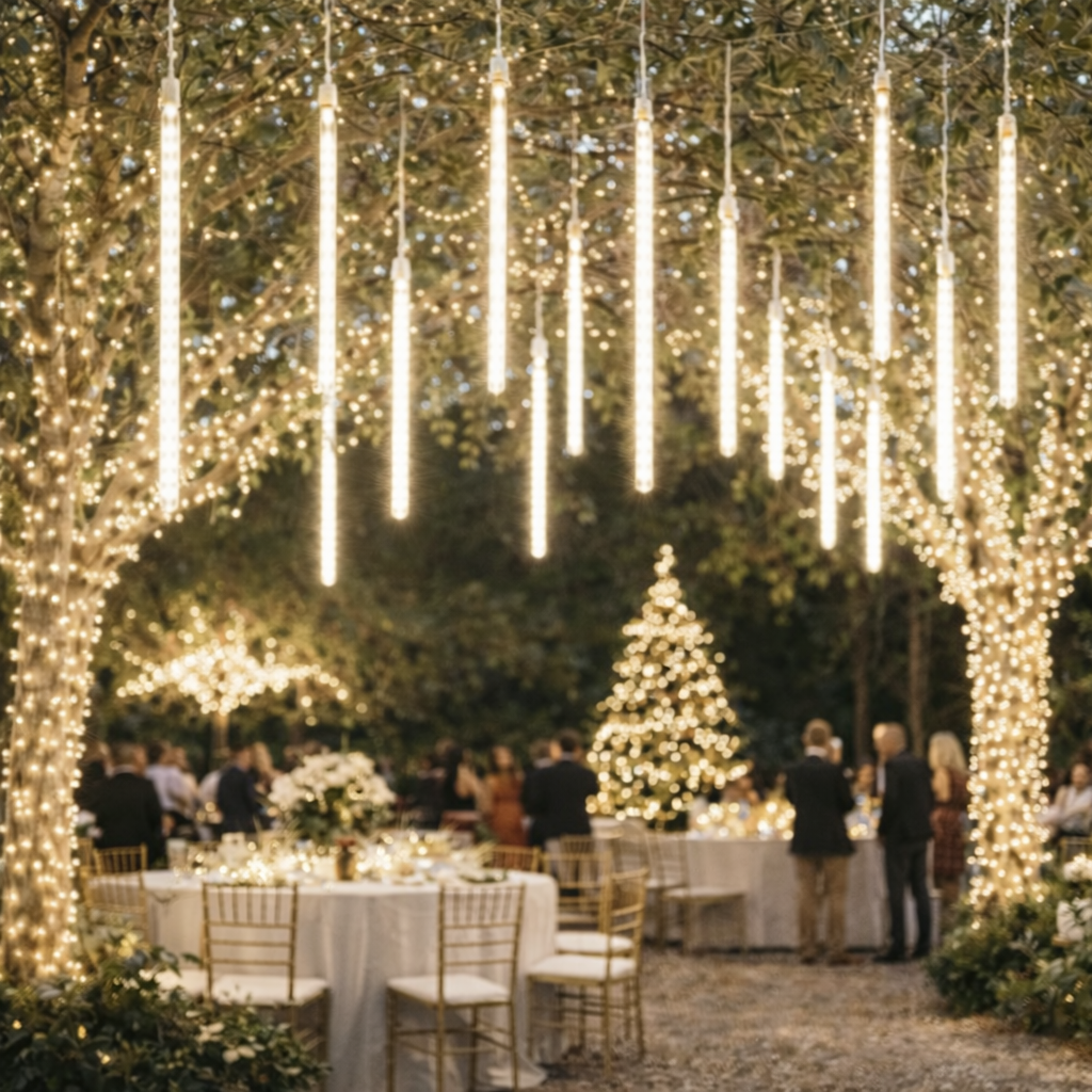 Serie Meteorito TopLuz – Guirnalda LED profesional con efecto lluvia, disponible en blanco cálido o frío, duradera, enlazable y perfecta para decoraciones exteriores de impacto visual.